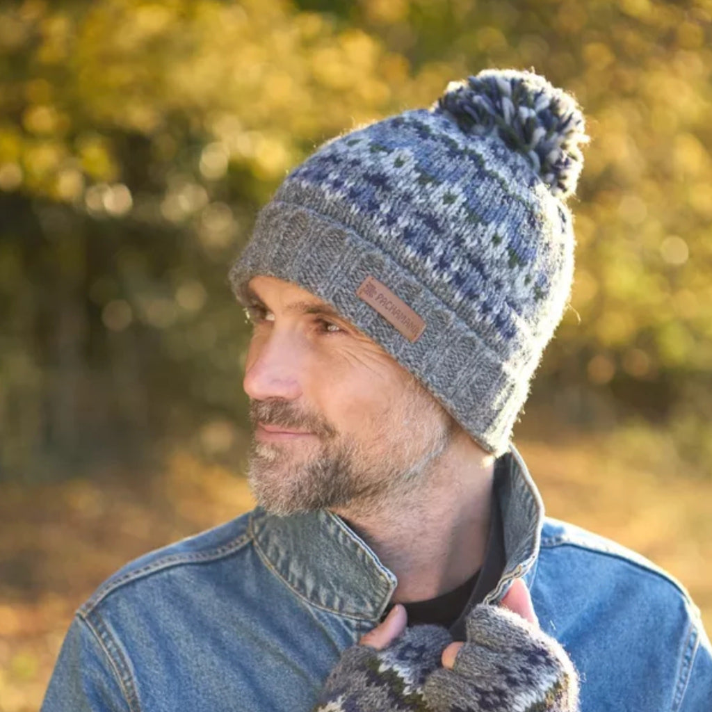 A traditional fair isle pattern on a timeless grey base, this 100% wool bobble beanie has a warm fleece lining around the forehead and ribbed roll back.
